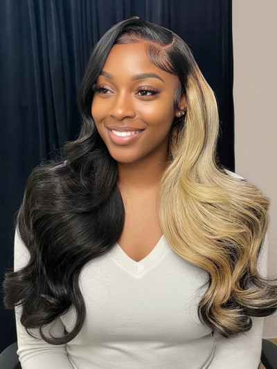 Side Part Blonde Highlight Body Wave 13x6 HD Lace Front Wig Skunk Stripe